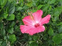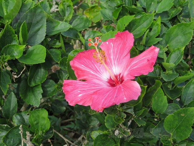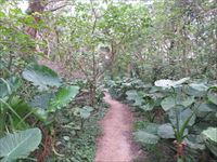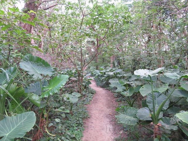 途中に真っ赤な花びらの植物が気になりますが、やぶの中に入るとハブによる命取りになるので遠目で眺めるだけにします。