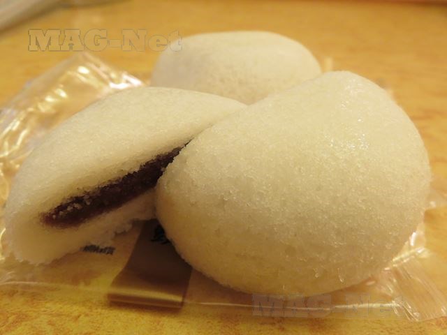 山芋と米の粉から作られるスポンジ状の白い饅頭の中には、あんこが入っています。