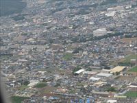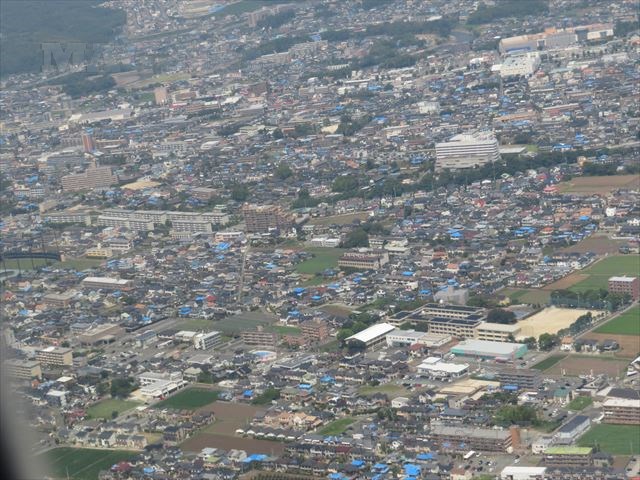 飛行機が熊本空港に降りようと高度を下げたときに、目に飛び込んできたのは屋根がブルーシートで覆われた家々の姿です。
