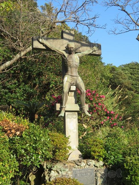 宗教弾圧のために大阪で捕らえられ長崎までの800kmの道のりを引かれ最後に十字架上で殉教した理不尽な彼の死に対して、像が掲げられています。