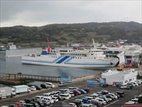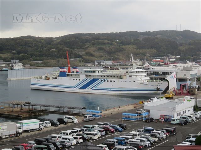車の乗降が終わり、出船に備えて船首の扉を閉めようとするまさにその瞬間です。
