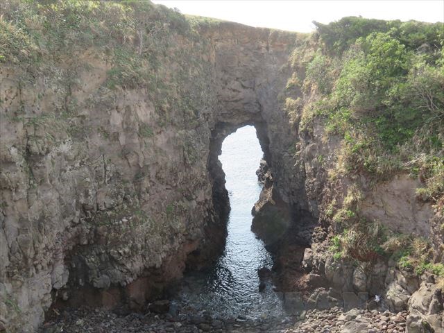 玄武岩が波の浸食によって削られてできた大穴に、鬼伝説が残っています。