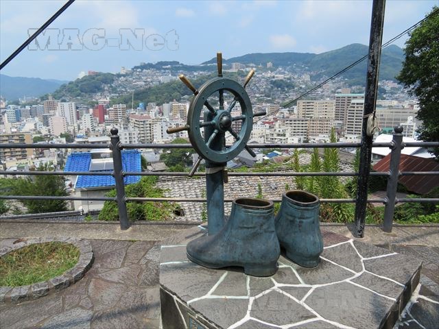 船の舵輪と大きなブーツが並んだ、長崎の町を見下ろす公園です。
