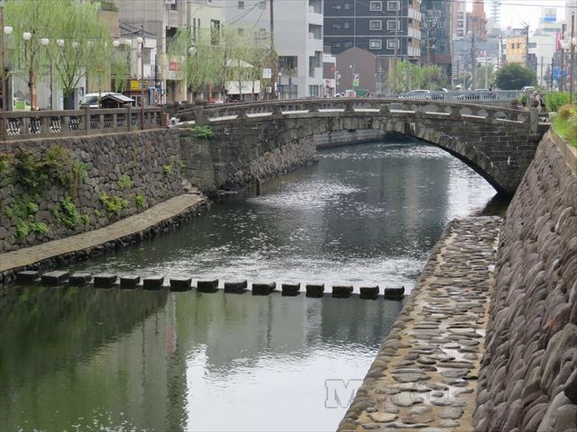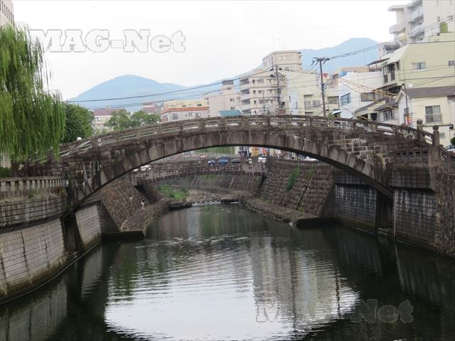 日本最古のアーチ型石橋で、「中島川」に架かる長さは22mの橋です。