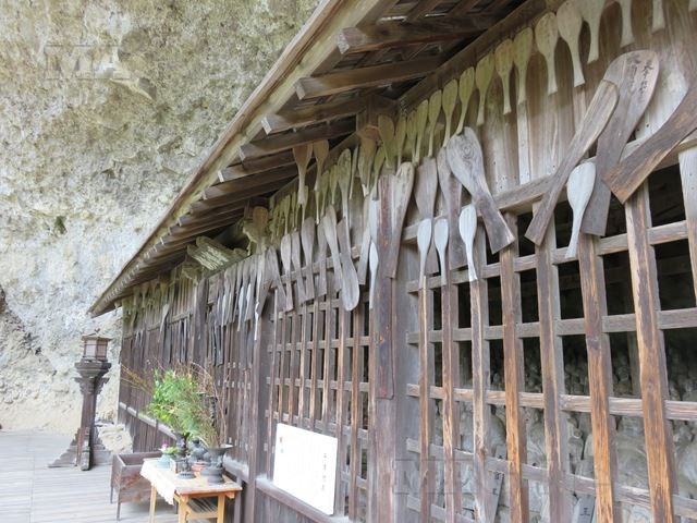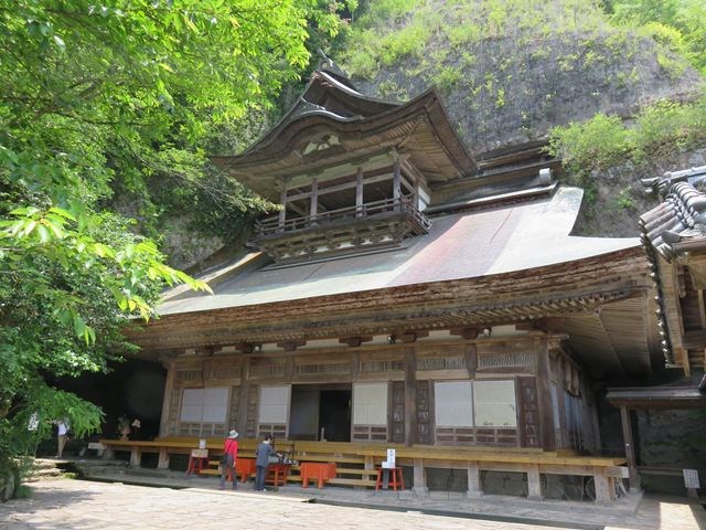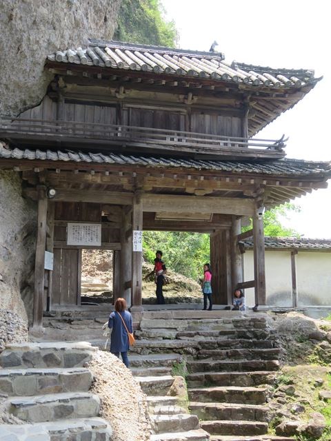 本殿も岩の間に埋め込まれるように建てられており、反対側には「耶馬溪」の緑豊かな山々を臨むことができます。
