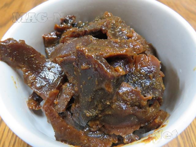 椎茸栽培が盛んなこの地域の特産品の椎茸を、辛子で和えたものです。