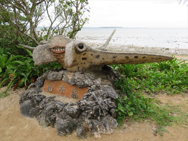 浜にはエイの形を模った置物が飾られており、その先の水面はサンゴ礁の岩場になっています。