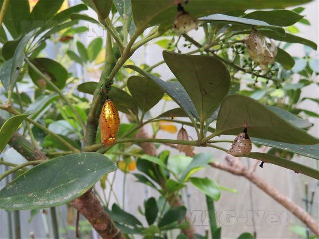 木々に金色をしたサナギがぶら下がっています。
