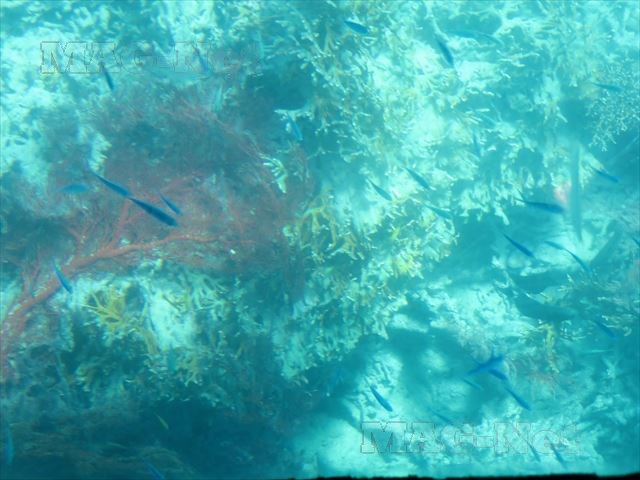 遠浅の海は船底がすぐ海底で、サンゴの間を黄色や青の魚が泳ぐ様子を見ることができます。