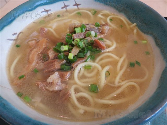豚骨の出汁に沖縄そばのような蕎麦粉を用いない麺から成り、ほんのり甘みのある食べやすいものです。