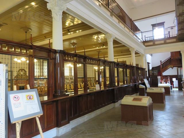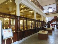 中に足を踏み入れると、内部を金網で区切った銀行の窓口が並んでいます。