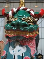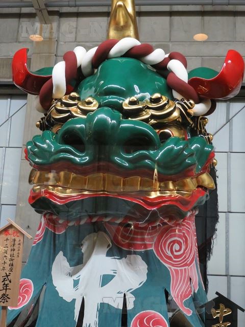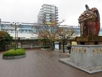 駅を出ると駅前には、曳山の赤獅子の像が建っています。