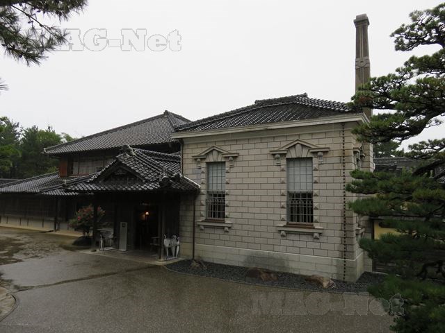 「旧高取邸」は煙突を持つ石造りの洋館を境に、左右に和風建築が並んでいます。