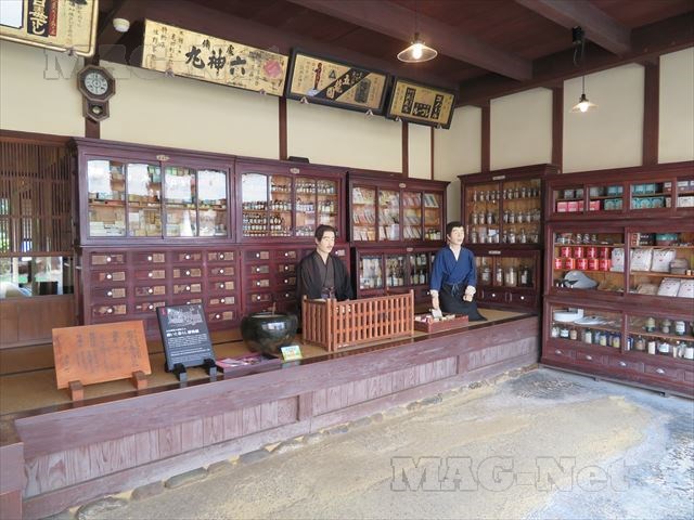 薬瓶がずらりと並んだ薬屋の店先が、出迎えてくれます。