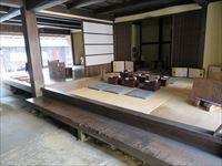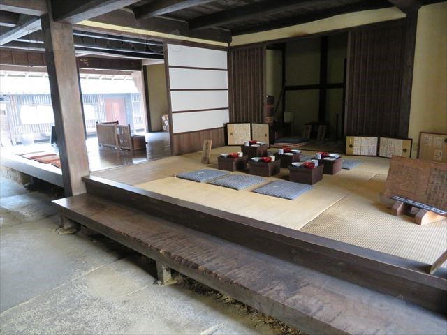 土間から見える番頭さんの部屋、その奥には家族が食事を取るためのお膳が、家族の数だけ並んでいます。