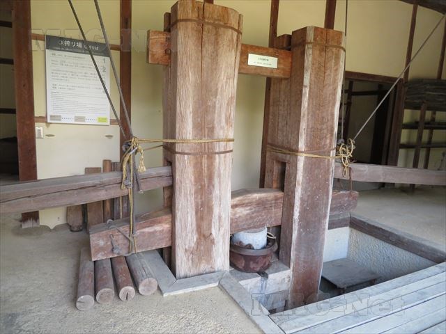 地下の奈落に下りると、回り舞台を人力で動かすしくみを見ることができます。