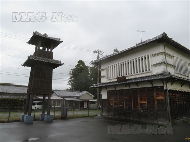 蔵と見間違えるような消防団の建物と、その横には火の見櫓が建っています。