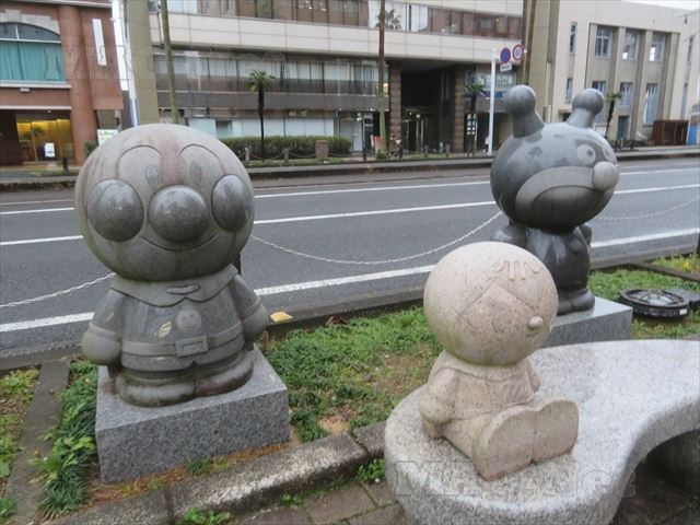 それに加えて、通りにはアンパンマン、バイキンマン、ドキンちゃんの石像が所々に飾られています。
