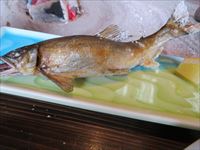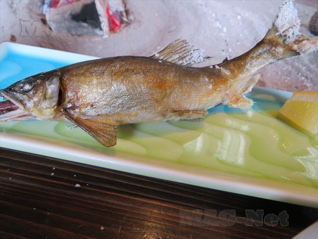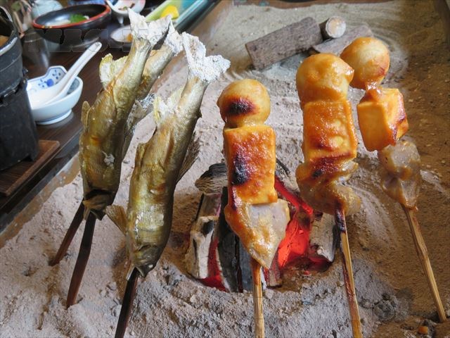 川で採れたアユも囲炉裏で焼かれ、美味しく食べることができます。
