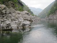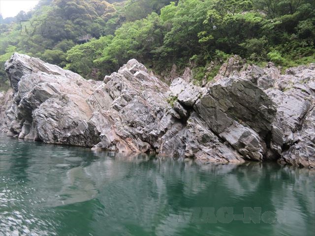 船上から見える両岸の岩は自然の隆起陥没のすさまじさを感じるかのように、地層が斜めに刻まれています。