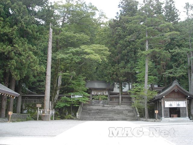 諏訪湖の南に位置するこの神社には、本殿への入り口のところに左右に1本ずつの御柱が祭られていました。
