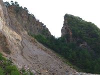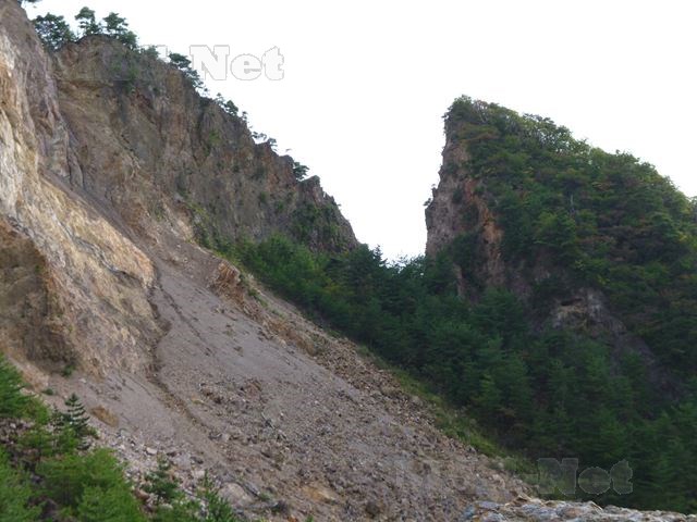 道の脇には大きな岩が転がっていて、かろうじて車道との柵で止まっている状態です。