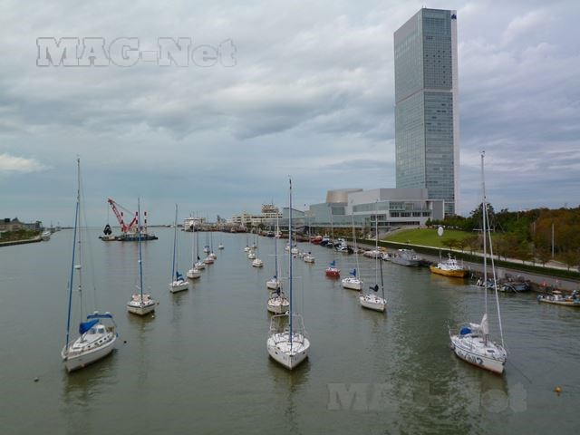 ヨットが水上に浮かび、規則正しい様は背景の「朱鷺メッセ」とあいまって、正確な幾何学模様を成しています。