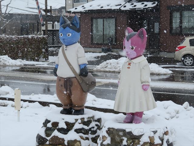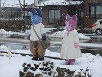 線路伝いの道を進んでいくと、途中のコンビニの駐車場に賢治の童話「グスコーブドリの伝記」の出てくるブドリとネリが仲良く並んで立っています。