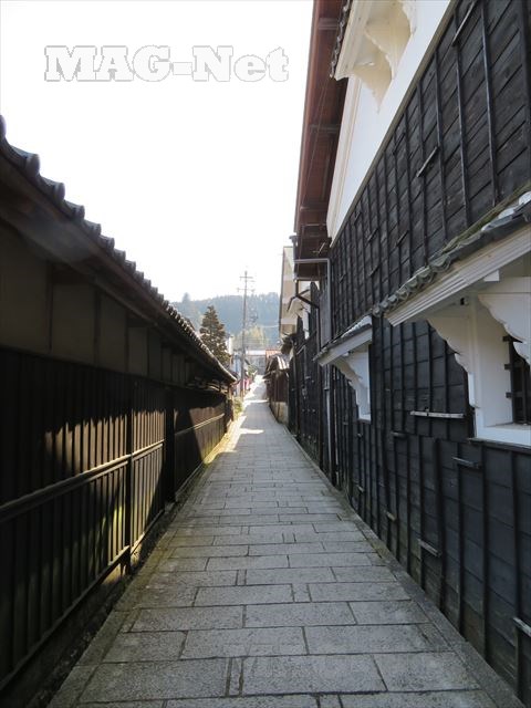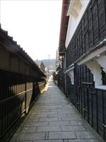 路地の両側には、木の壁と土蔵が迫っています。