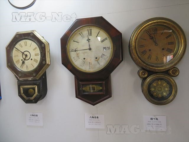 店の中には、年代物の掛け時計が多数展示されています。