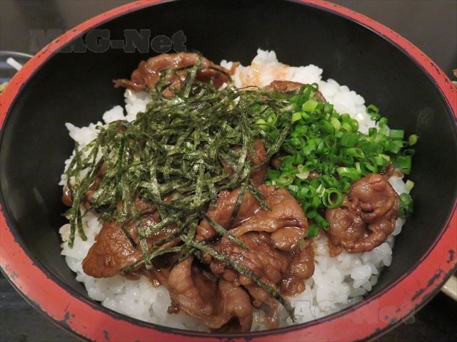 甘辛く味付けをした飛騨牛がお櫃のご飯のうえに敷き詰められています。