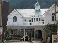 道が右へ90度に曲がる辺りに、白い洋館を模した建物があります。