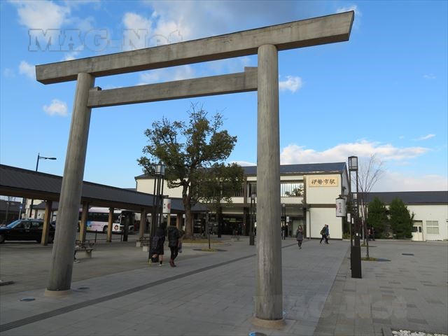 駅前にも神宮の参道方向に、大きな鳥居が建っています。
