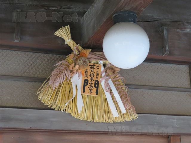 この故事にあやかって、「蘇民将来子孫家門」の護り札をしめ縄に付けて、一年中門口に飾って無病息災を願うことを今に受け継いでいるのです。