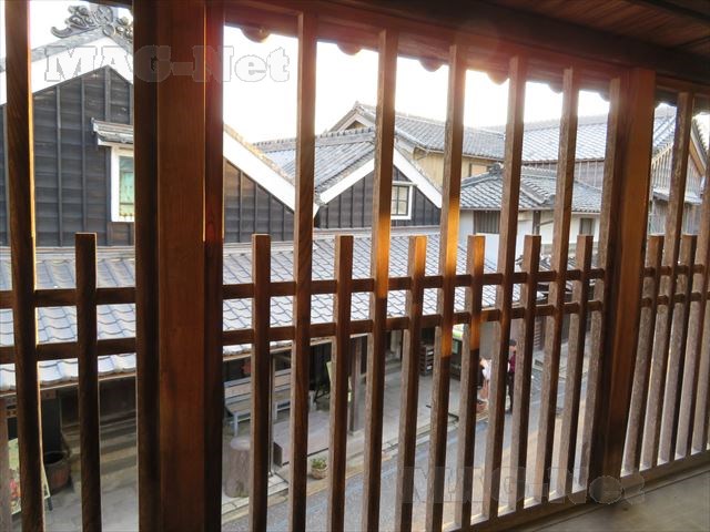 格子窓を通して、道向こうに並ぶ蔵を見渡すことができます。