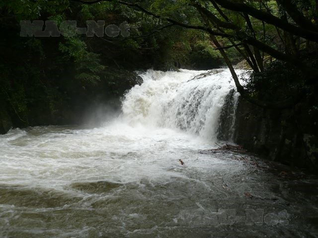 落差はさほどないのですが、当日の増水で川幅が広がり、そこから一気に落ちる水勢には迫力があります。