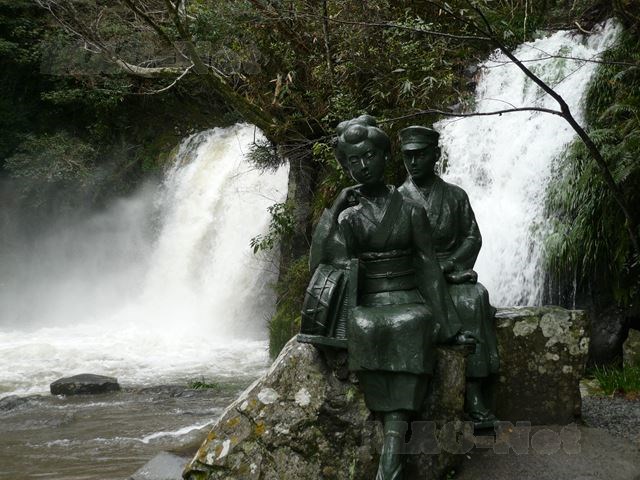 2つの糸を引くの滝(通常は1ヶ所なのかも知れませんが)をバックに、踊り子と彼女に魅せられた学生のブロンズ像が建っています。