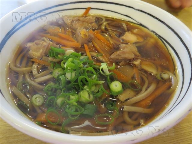 濃い目の出汁で、中にはニンジン、シイタケ、鶏肉などが入っています。