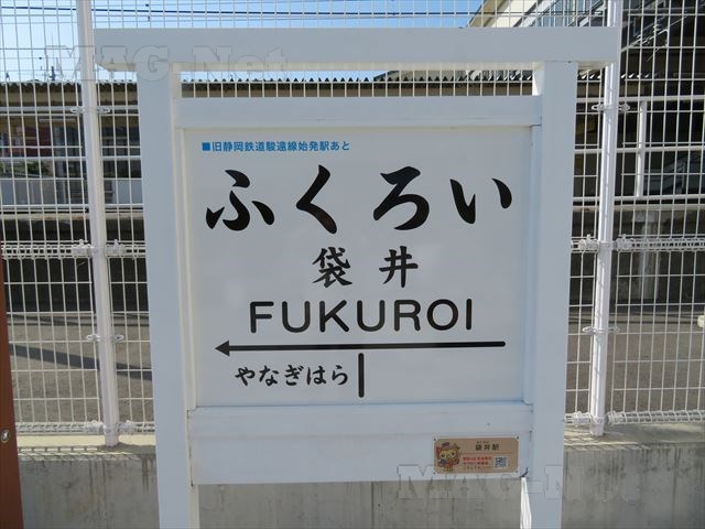 旧静岡鉄道駿遠線の袋井駅で使われていた駅名標が、駅前ロータリの片隅に飾られています。