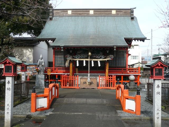 朱色があざやかな社殿をもつこの神社は、吉原地区最古の神社です。